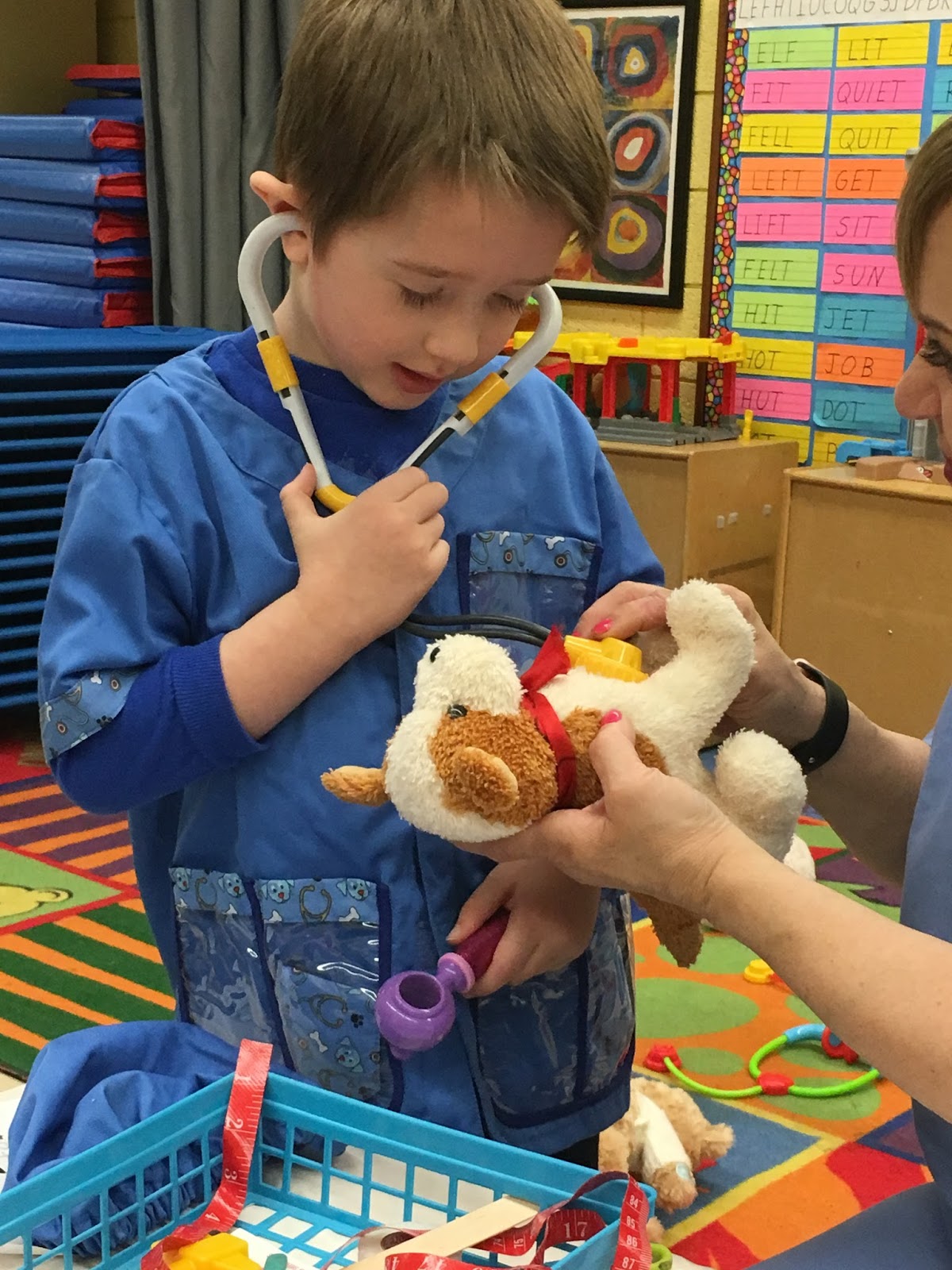 We had a "beary" good week. We enjoyed bringing our teddy bears to class and taking them to the "Teddy Bear Hospital". Some of them had ear aches, broken legs, and others had their annual physicals. We used our language skills to get a complete medical history on our bears. We put a splint on a bear with a broken leg and administered shots to sick bears. One bear had an accident and got completely covered with bandages.